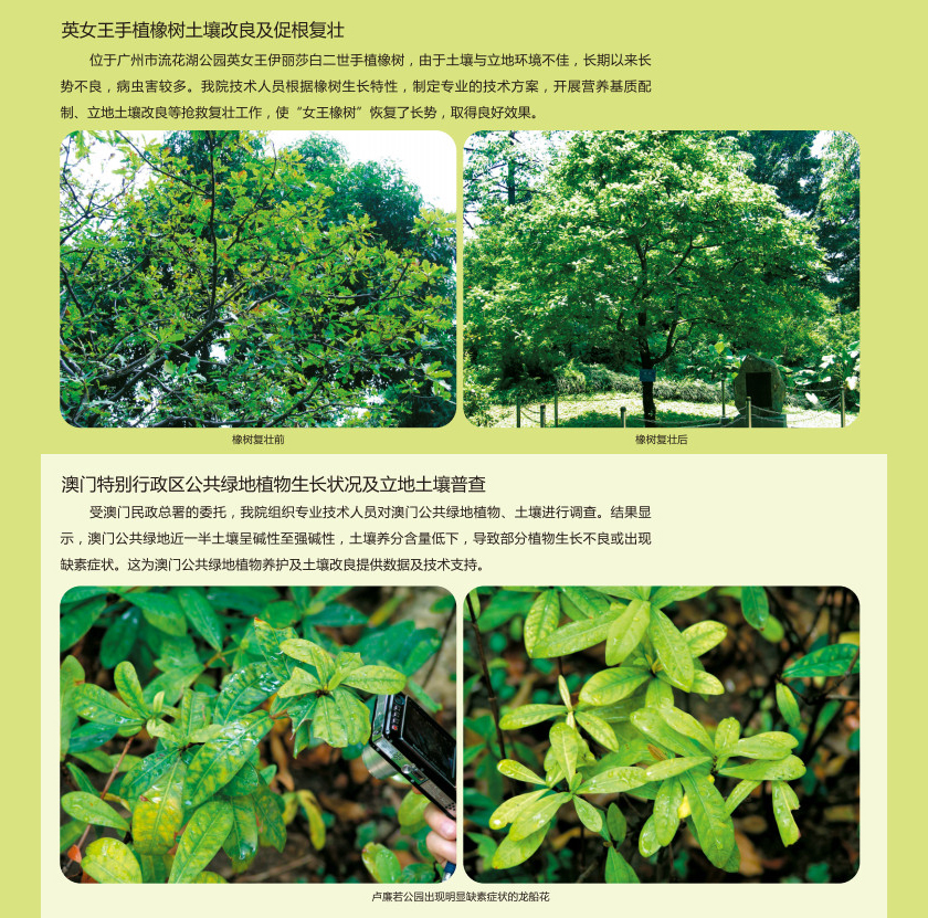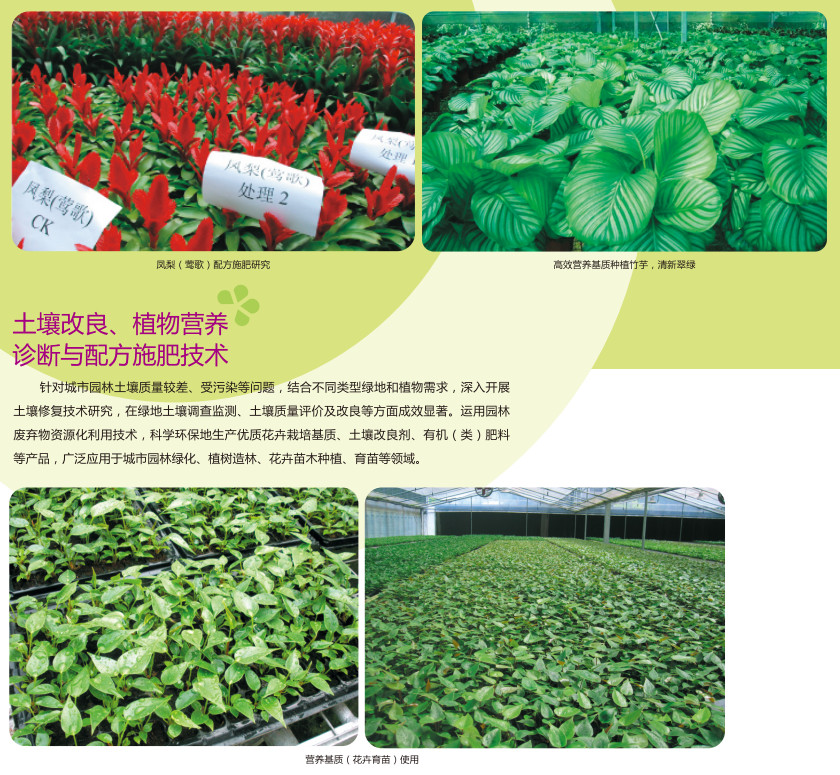 针对城市园林土壤质量较差、受污染等问题,结合不同类型绿地和植物需求,深入开展土壤修复技术研究,在绿地土壤调查监测、土壤质量评价及改良等方面成效显著。运用园林废弃物资源化利用技术,科学环保地生产优质花卉栽培基质、土壤改良剂、有机(类)肥料等产品,广泛应用于城市园林绿化、植树造林、花卉苗木种植、育苗等领域。
