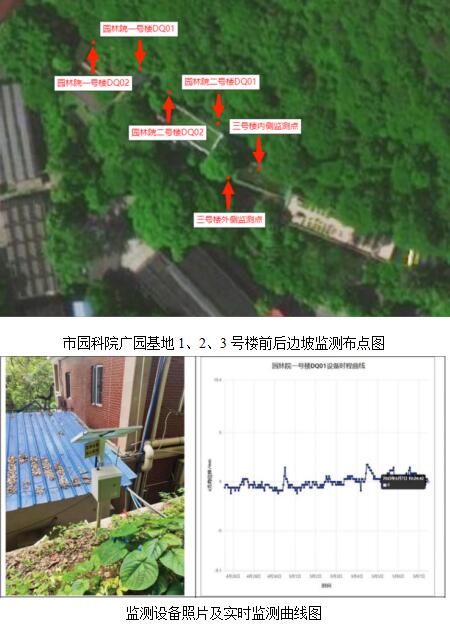 市园科院地质灾害动态监测系统由 26 个实时动态监测点组成,实现了全院各基地重要挡土墙和边坡安全检测全覆盖。该系统是市园科院落细落实安全生产工作、提升安全监测“人防﹢技防﹢物防”综合能力的重要举措,是开展“党旗插在项目上”攻坚工作的显著成效。下一步,市园科院精 细化管理攻坚组将在院党委的正确领导下持续推进高质量 发展工作创新,以科技支撑提升安全管理水平,助力汛期安 全“早发现、早处置”。