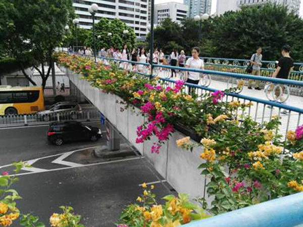 广州市人行天桥、立交桥绿化植物以紫花簕杜鹃为主,为提升天桥绿化景观,转变花色单一的现状,我院经深入研究,开创簕杜鹃多花色搭配种植新模式,并于2015年首次在云台花园人行天桥试种成功。今年8月,我院优选出柠檬黄簕杜鹃+水红簕杜鹃组合,种植于环市路建设六马路人行天桥,花团锦簇的红、黄双色簕杜鹃互相映衬,十分娇艳,桥梁绿化景观焕然一新,市民无不驻足观赏,称赞连连。簕杜鹃多花色搭配种植模式将逐步在广州市天桥绿化推广应用。