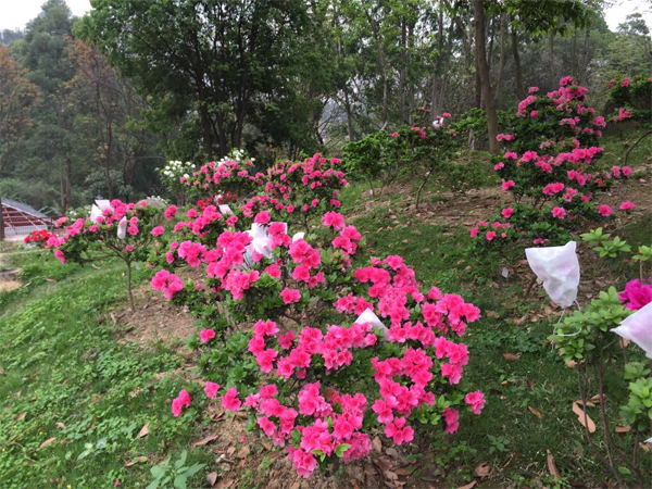 在省科技厅“广东杜鹃花属植物资源收集和开发利用研究”与市科创委“广州耐热杜鹃资源收集和创新开发研究”等项目支持下,观赏植物种质资源圃杜鹃花专类园建设初具规模。园区建设面积约20亩,因地制宜,依山体走势规划,坡度自然,配置充满野趣。现收集杜鹃花科植物近140种,种植筛选了“霸王红”、“丹顶”、“丹彩”、“红孩儿”、“迎春6号”等适应广州地区的品种。杜鹃花园的建设将为杜鹃花在广州地区的保育研究、开发评价、应用推广提供场地,培育的品种将有效丰富广州园林绿化建设素材。