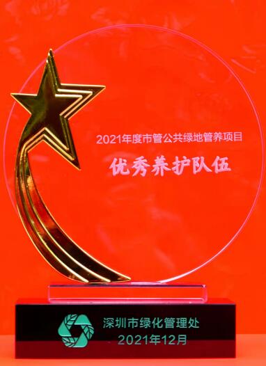 2022年1月27日,在深圳市绿化管理处举办的2021年度市管公共绿地管养项目年度表彰会上,我院承接的深圳市绿化管理处悬挂绿化管养项目荣获“2021年度优秀养护队伍”奖状及奖杯,其中部门技术人员赖晋灵、陈鹏获得优秀管理人员称号。