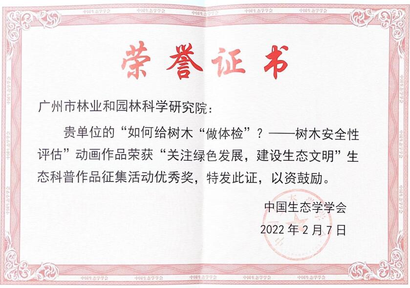 近日,我院自主创作的科普视频《如何给树木“做体检”?——树木安全性评估》荣获中国生态学学会“关注绿色发展,建设生态文明”生态科普作品征集活动优秀奖。