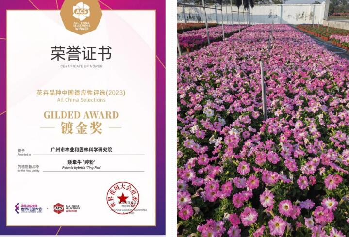 2023年4月28——5月3日,世界花园大会在中国浙江海宁盛大举行,此次大会同步举办了对标全球最具权威的花卉新品种评选组织——全美选种组织(All-America Selections,AAS)的“花卉品种中国适应性评选(ACS)”活动,此次评选面向全球育种公司、机构及个人征集花卉新品种,由来自国内外的知名育种学家经过严格审核、评选,最终评出特别金奖1个、金奖3个、镀金奖6个、银奖15个、优秀奖26个。其中,市园科院培育的“广州1号”(‘婷粉’)矮牵牛荣获大赛镀金奖。