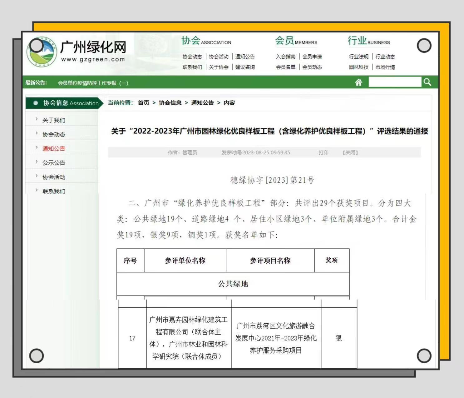 近日,广州市城市绿化协会公布了2022-2023年广州市园林绿化优良样板工程(含绿化养护优良样板工程)评选结果,该评选活动旨在不断提升我市园林绿化建设水平,促进我市园林绿化行业科技进步,推动绿化工程设计、施工和养护管理水平再上新台阶。我院《广州市荔湾区文化旅游融合发展中心2021年-2023年绿化养护服务采购项目》获2022-2023年广州市园林绿化优良样板工程养护类银奖。