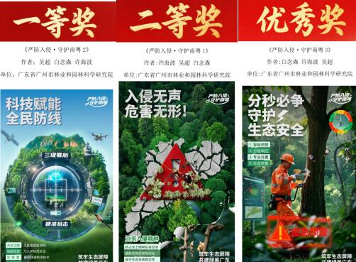 市园科院参赛海报作品“严防入侵·守护南粤”系列分别获得一等奖、二等奖、优秀奖。该系列海报作品紧密围绕生物灾害防控的核心议题,巧妙融合了有害生物防治领域的前沿成果,通过三篇章递进式设计,全面直观揭示了生物灾害防控的重大意义、紧迫需求及技术精髓,有效传递了生物防治理念,深切呼吁社会各界携手共建绿美广东生态屏障。