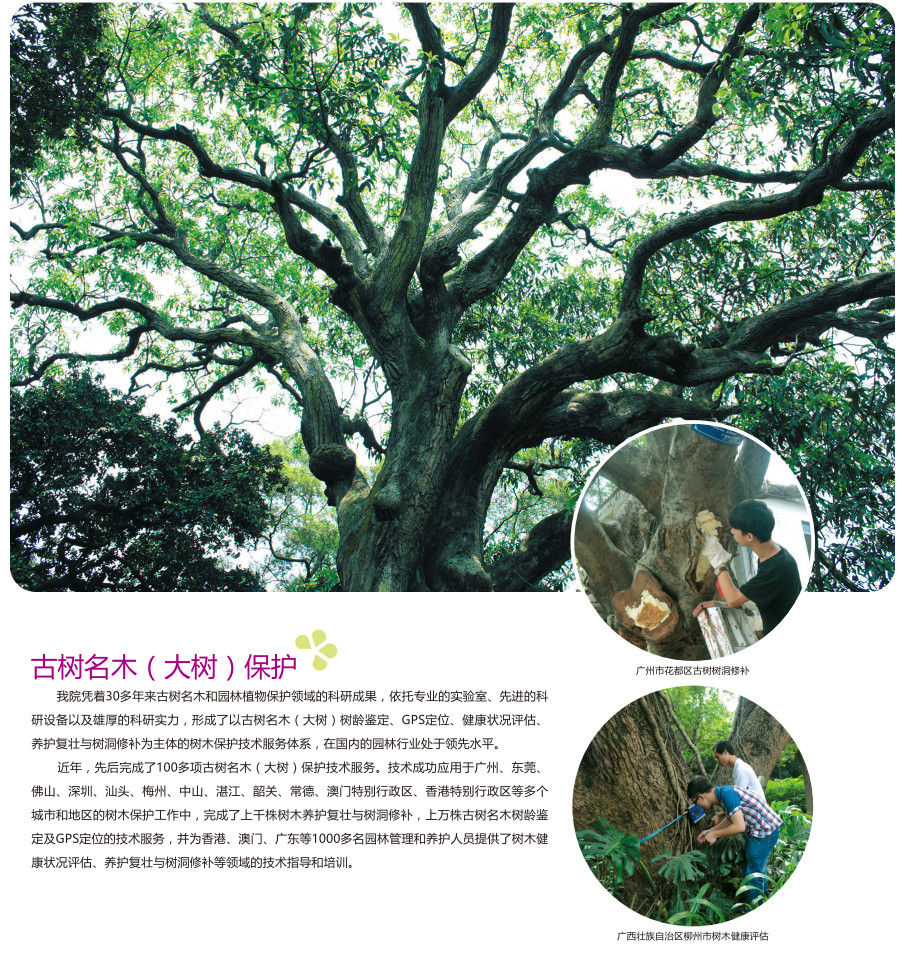 本院凭着30多年来古树名木和园林植物保护领域的科研成果,依托专业的实验室、先进的科研设备以及雄厚的科研实力,形成了以古树名木(大树)树龄鉴定、GPS定位、健康状况评估、养护复壮与树洞修补为主体的树木保护技术服务体系,在国内的园林行业处于领先水平。近年,先后完成了100多项古树名木(大树)保护技术服务。技术成功应用于广州、东莞、佛山、深圳、汕头、梅州、中山、湛江、韶关、常德、澳门特别行政区、香港特别行政区等多个城市和地区的树木保护工作中,完成了上千株树木养护复壮与树洞修补,上万株古树名木树龄鉴定及GPS定位的技术服务,并为香港、澳门、广东等1000多名园林管理和养护人员提供了树木健康状况评估、养护复壮与树洞修补等领域的技术指导和培训。