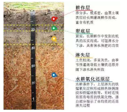 耕作土壤剖面:耕作土壤土体构成复杂,大致可分为耕作层、犁底层、生土层、死土层。