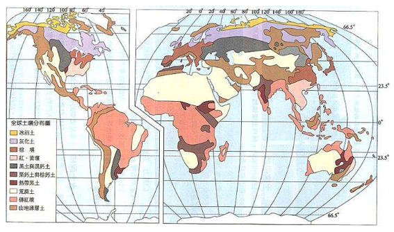 世界土壤类型分布:地带性土壤沿经纬度水平分布由北至南依次为:冰沼土→灰化土→灰色森林土→黑钙土→栗钙土→棕钙土→荒漠土→高寒土→红壤→砖红壤。但在东、西两岸略有差异,大陆西岸从北而南依次为:冰沼土→灰化土→棕壤→褐土→荒漠土;大陆东岸自北而南依次为:冰沼土→灰化土→棕壤→红、黄壤→砖红壤。