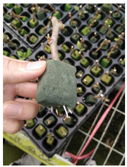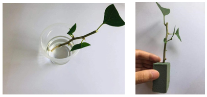 4. 扦插:扦插前吧插穗底部浸泡在生根水中5~8秒,把花泥放入清水浸泡充分吸水,扦插时深度控制在插穗长度的三分之一左右。