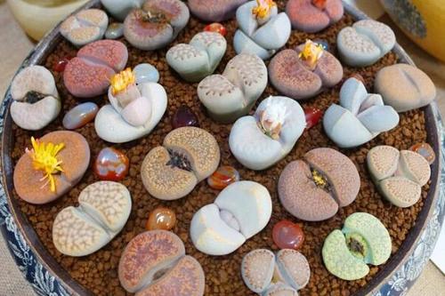 生石花生活在非洲南部的沙漠地区,它的颜色、形状与卵石惟妙惟肖,叶肥厚多汁,裹成卵石状,能贮存水分。生石花开金黄色的花,非常好看,而且一株只开一朵花,不过只开一天就凋谢。生石花生成这个样子,当然是为了鱼目混珠,蒙骗动物,避免被吃掉。生石花喜欢与沙砾乱石为伴, 要是离开了这种环境就很难活命。