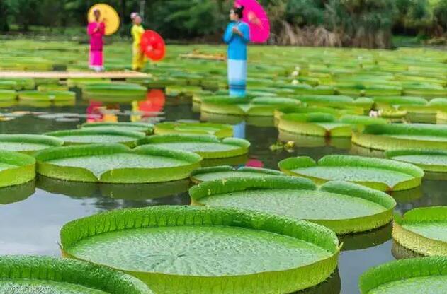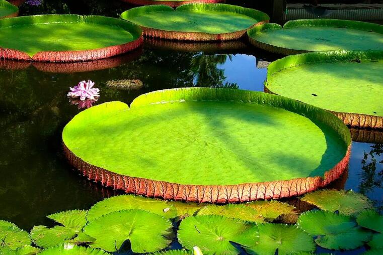王莲具有世界上水生植物中最大的叶片,直径可达3米以上,叶面光滑,叶缘上卷,犹如一只只浮在水面上的翠绿色大玉盘。它的叶片具有非常大的浮力,最多可承受六七十千克重的物体而不下沉。水生植物内一般含有大量水,因此格外脆嫩,然而王莲同样整日泡在水中,它又是如何坚挺承重的呢?秘密就藏在王莲叶片的背后,它有8条巨大的主叶脉,如钢梁般从中心辐射到边缘。相邻两条主脉之间还有许多垂直生长的支脉,将整张叶片切割成纵横交错的网格。不仅如此,王莲的叶片和叶脉内还具有很多大的空腔,腔内充满气体也进一步增加了叶片的浮力。