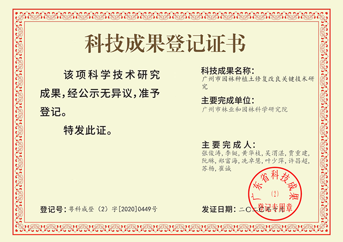 2020年9-10月,由我院自主实施完成的广东省科技计划项目“珠三角地区绿地土壤污染评估体系及修复改良技术研究”及广州市部门预算项目“广州市园林种植土修复改良关键技术研究”陆续获得广东省科技成果登记证书。