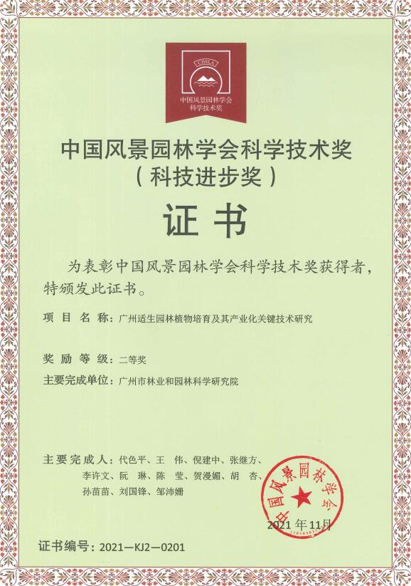 2021年,经中国风景园林学会评审,我院主持完成的《广州适生园林植物培育及其产业化关键技术研究》获2021年中国风景园林学会科技进步二等奖。