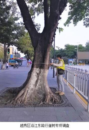 目前,我院已组织专业技术人员对越秀区东风路、沿江路等路段的行道树开展专项调查,逐株核实树木树种、位置、类别、状态、生长状况、立地环境等信息,做到全覆盖、不遗漏,按照“一树一档”原则建立树木电子档案,后续将依托广州市数字绿化平台统一录入树木信息,实现树木智慧化、科学化管养。