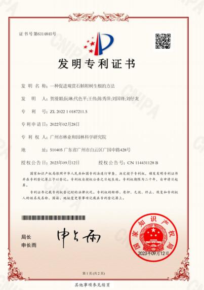 市园科院植物研究所申报的《一种促进观赏石斛附树生根的方法》获得国家发明专利授权,专利号:ZL 202210187211.5。