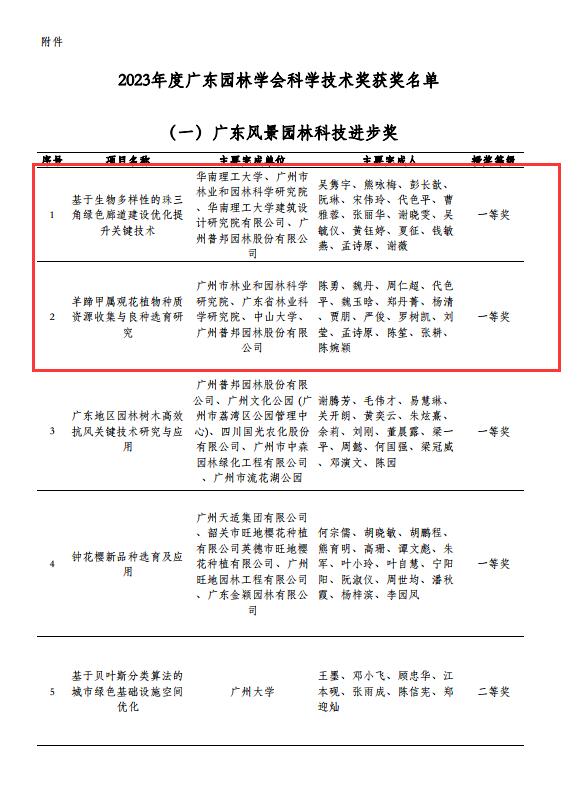 2023年12月15号,市园科院作为第一完成单位的成果“羊蹄甲属观花植物种质资源收集与良种选育研究”,和作为第二完成单位的成果“基于生物多样性的珠三角绿色廊道建设优化提升关键技术”荣获“2023年度广东园林学会科学技术奖”广东风景园林科技进步一等奖。