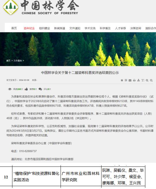 2024年3月8日,中国林学会发布《中国林学会关于第十二届梁希科普奖评选结果的公示》,市园科院《“植物保护”科技资源科普化实践活动》获得“科普活动类”梁希科普奖(林业行业最高科普水平奖项)。