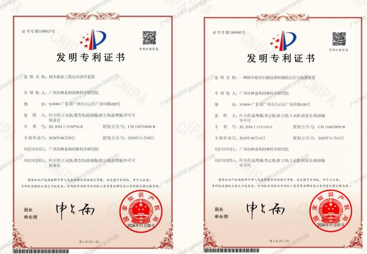 市园科院树木保护中心申报的《树木根系三维定向诱导装置》(专利号:ZL 2024 1 1194794.X)、《一种树木根系扫描仪器的辅助定位与校准装置》(专利号:ZL 2024 1 1111101.6),获得国家发明专利授权。
