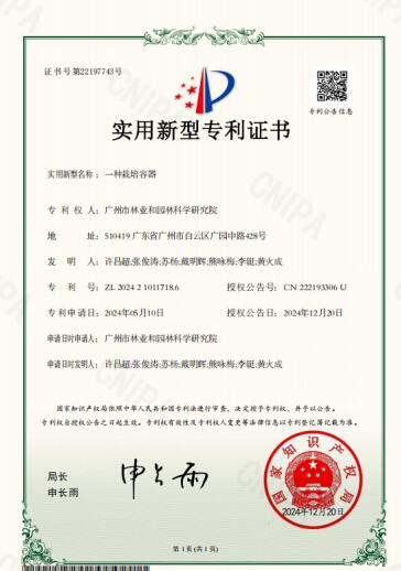 12月20日,市园科院土壤环境研究所申报的实用新型专利《一种栽培容器》(专利号:ZL 2024 2 1011718.6),获国家知识产权局专利授权。