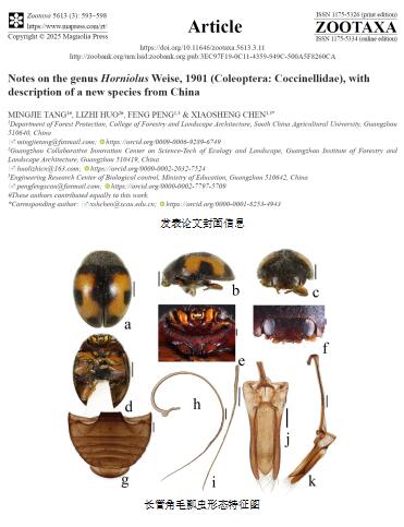 近日,市园科院植物保护研究所科研团队与华南农业大学科研团队,在国际动物分类学期刊《ZOOTAXA》上合作发表了瓢虫科新物种——长管角毛瓢虫Horniolus longitubus Tang, Huo et Chen, 2025。该新种由市园科院研究团队在帽峰山森林公园和大封门森林公园采集发现,由市园科院科研团队与华南农业大学陈晓胜副教授团队共同鉴定发表。
