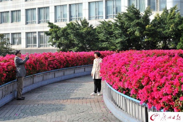 2017年2月12日,广州市东风路一座圆形天桥上,红色的勒杜鹃已然盛放,不少走上天桥的行人都会稍作停留,掏出手机拍下这个美丽的场景。花城广州,悄然进入了第一波赏花期。广报记者 杨耀烨 摄