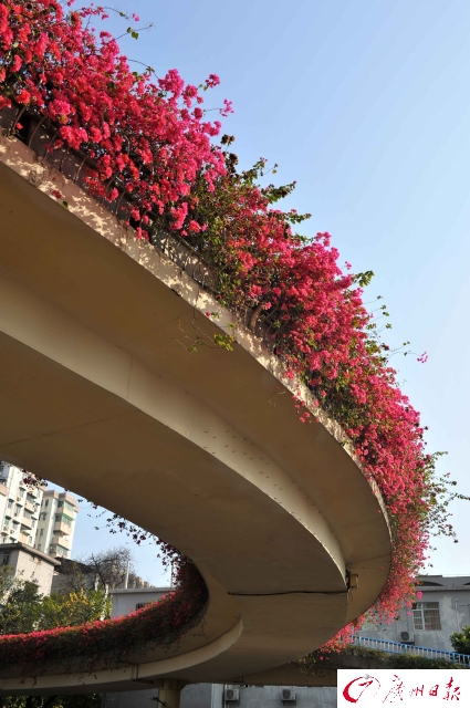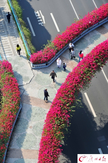 进入立春,温暖的广州已呈现出勃勃生机。特别是近日已经盛放的簕杜鹃,更是率先给广州天桥“穿上新衣”。