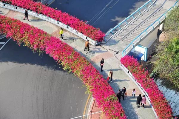2017年2月12日,东风路一座圆形天桥上,红色的勒杜鹃已然盛放,不少走上天桥的行人都会稍作停留,掏出手机拍下这个美丽的场景。花城广州,悄然进入了第一波赏花期。