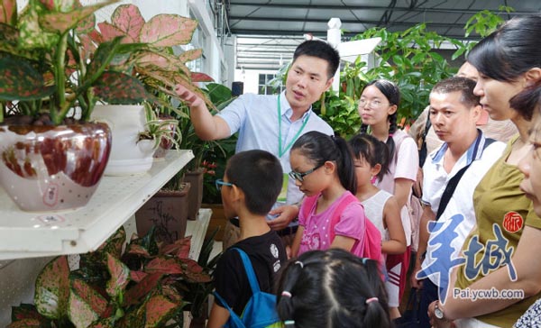 14个亲子家庭跟着王玮在白云区的艺家园林超市中导赏,兴致勃勃地边走边看边问,王玮也在导赏过程中透露了许多养植物的小诀窍。