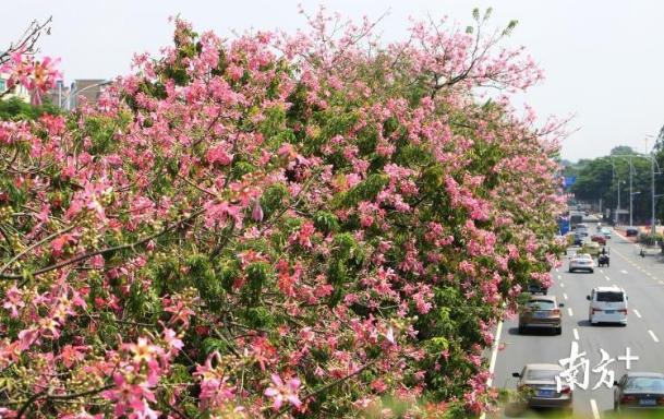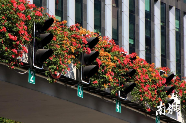 11月的北方早已寒风萧瑟,树木凋零;广州却是另一番光景:蓝天白云下,蜿蜒于高楼间的高架桥上的簕杜鹃争相绽放,紫色、红色、黄色等颜色搭配的花道,仿佛给高架桥描上了漂亮的花边。