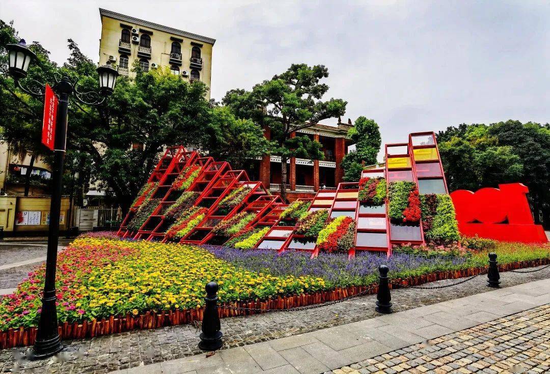 漫步于荔湾区沙面岛,映入眼帘的是“众志成城”立体花坛。