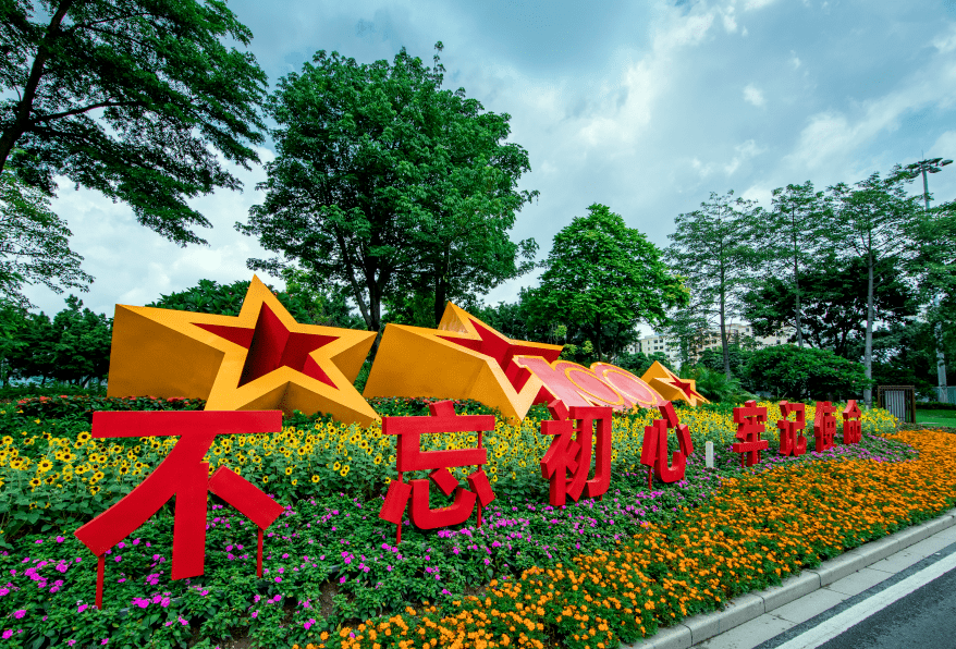 该主题花坛以新改造的公园绿地景观为背景,搭配金黄色五角星,宛如向市民娓娓道来广州那一段沧桑厚重、源远流长、波澜壮阔的革命岁月,并以此祝福伟大的党在星光璀璨的道路高歌前行。