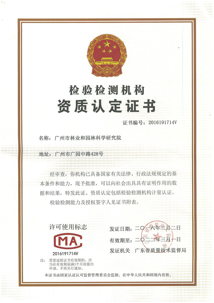 广州市林业和园林科学研究院检测中心(以下简称检测中心)是从事园林土壤、肥料、植物营养元素、水质、园林植物病虫害检测的专业检测机构,从事园林绿化检测已有十几年,已取得广东省质量技术监督局的检验检测机构资质认定证书(CMA证书编号:2016191714V),具有CMA资质和第三方实验室地位。