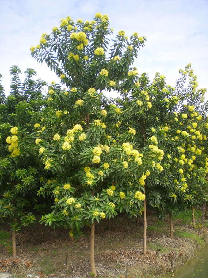 桃金娘科,金蒲桃属。常绿中型乔木,株高可达20米,花金黄色,伞房花序聚生在枝条的顶端,花期长,盛花期4~5月及11月。适合种植于公园、庭院或城市道路旁绿地等景观美化。