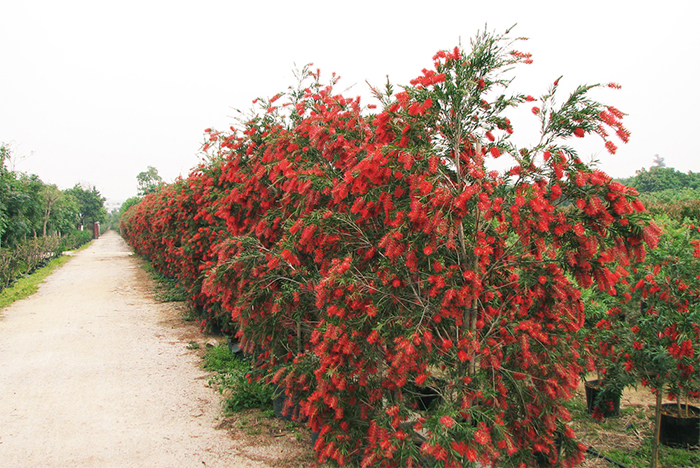 桃金娘科,红千层属。常绿小乔木。株形婆娑披垂,花期为1~3月及11~12月,穗状花序着生枝顶,瓶刷状,花鲜红色。适合于马路中间绿化带、机关、学校大院、公园、庭院等作观花小
