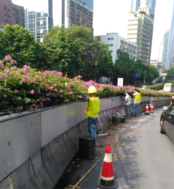 国庆期间,我院白云苗圃天桥项目部工作人员坚守岗位,集中力量做好天桥绿化保障工作。一是院领导亲自部署应急事故处理。10月2日,东濠涌立交桥往东风西路匝道发生交通事故,桥梁绿化设施遭到严重破坏。刘连海副院长和白云苗圃刘悦明书记亲临现场,连夜指挥、督促施工人员加快抢修,使桥梁绿化迅速恢复原貌。二是加强安全巡查,做好绿化设施维护工作。国庆期间共修复了机场立交、东晓南立交、盘福立交、援外仓立交、桂花岗人行天桥的绿化挡板370多米、农林下路立交排水系统120米、黄埔大道立交供水系统900米,及时排除险情,保障了道路安全。