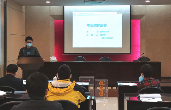 2020年4月2日下午,我院2020年专业技术人员中级职称聘任考核汇报会在院3号楼一楼会议室召开,院领导、学术委员会专家、政工部部长、科技推广与培训部部长、职称聘任申报人参加会议。