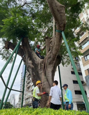 依托我院与澳门市政署签订的《澳门古树名木技术支援协议书》,为了更好地保障澳门特别行政区的古树名木健康状况,我院的“树木医生”于10月16日至19日前往澳门特别行政区,对位于澳门半岛民国大马路上的29棵古树进行了健康评估,并对一棵曾经遭遇台风袭击的凤凰木古树进行“把脉问诊”。