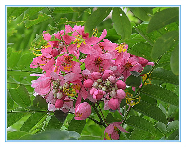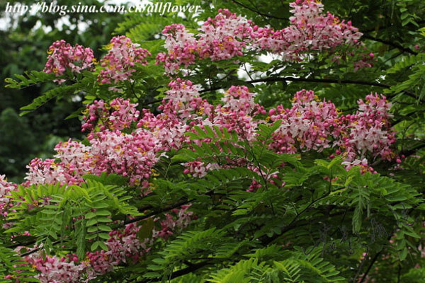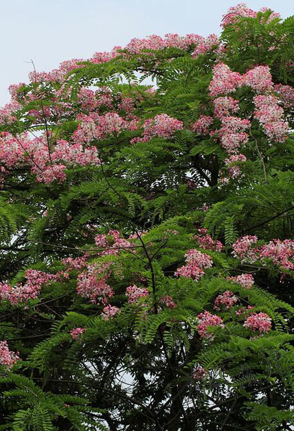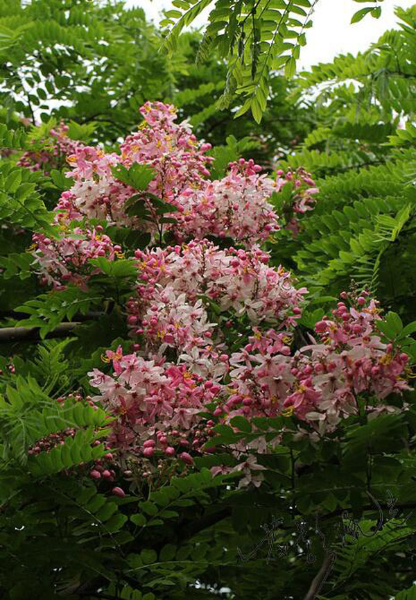 又名彩虹旃(zhān)那,为爪哇决明与腊肠树的杂交种。落叶小乔木,树干及枝条下垂状,具针刺。花开红、黄、白三色,花团锦簇,风采迷人,花姿娇艳非凡,适合庭园观花树种或做行道树。