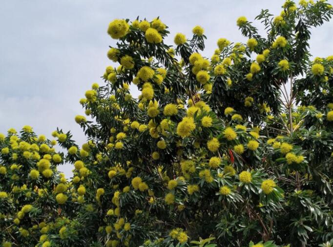 又名金蒲桃,别名澳洲黄花树,原产澳洲,桃金娘科常绿观花小乔木。其花期长、花量大,鲜艳夺目,鲜黄色的小花聚生在枝条的顶端,排成伞房花序,远看仿佛一个个憨态可掬的熊猫脸。盛花期11月—12月。金黄熊猫性喜光照充足的温湿环境,对栽培土质选择不严,耐瘠薄,病虫害少,是一种十分优良的园林绿化树种。