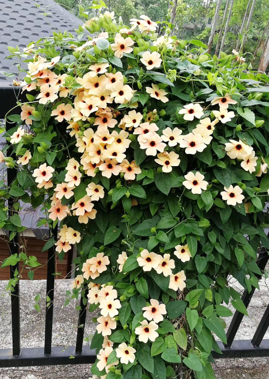 爵床科山牵牛属缠绕草本,原产非洲及亚洲热带,我国广东、福建已有栽培。其黄色、橙色或棕黄色的花朵传递给人一种快乐向上的感觉,花藤可沿棚架爬高至两到三米,适合棚架绿化、吊盆栽培。