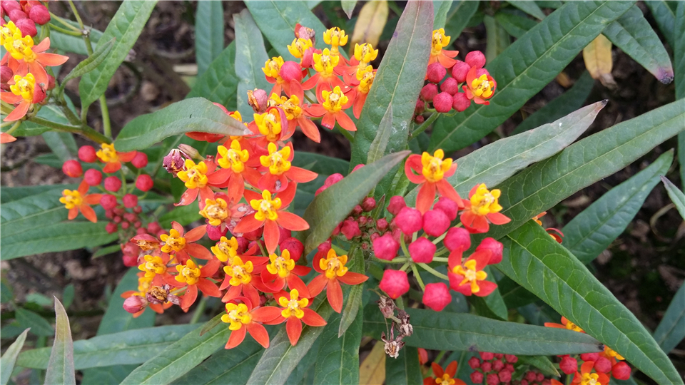 萝藦科马利筋属多年生直立草本,灌木状,株高0.5~2 m。全株含白色乳汁,幼枝被细柔毛。叶对生,纸质,披针形至椭圆状披针形。聚伞花序顶生或腋生,着花10~20 朵;花紫红色。花期6~11 月,果期8~12 月。马利筋在我国南北各地常见栽培。其叶片翠绿挺拔,花序秀美,小花密集, 复色花朵金黄朱红相叠,十分引人注目。可用于庭植、花坛栽植、切花和盆栽。其全株有毒,应用时需注意。