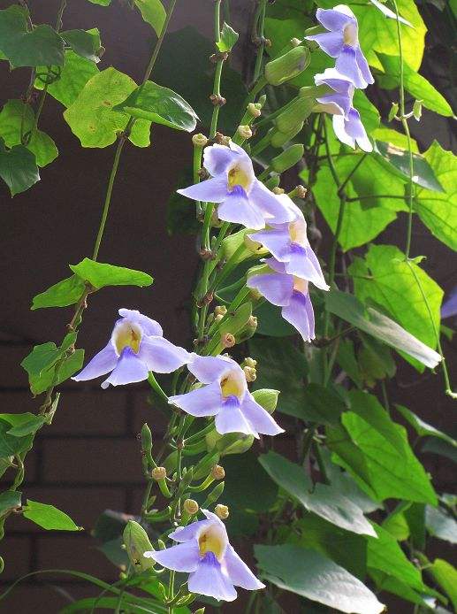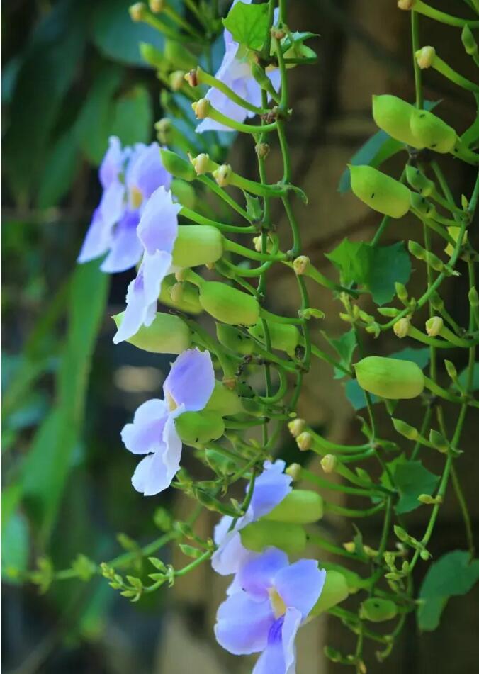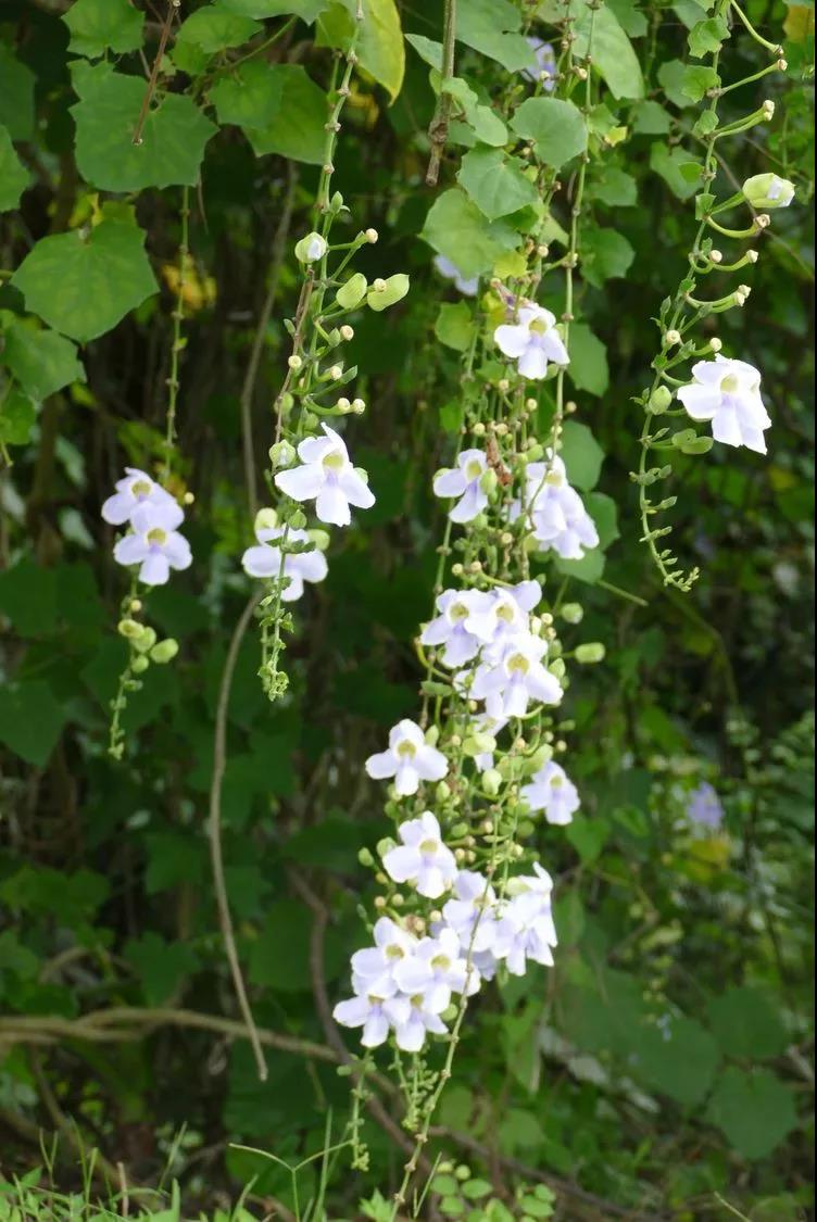 爵床科山牵牛属粗状木质大藤本,高可达7米以上。性喜阳光充足,土质湿润,排水良好的避风地。可作观赏植物亦可药用。大花老鸦嘴植株粗壮,覆盖面大,花大而繁密,朵朵成串下垂,花期较长,适合用于大型棚架、中层建筑、篱垣,也可用于城市堡坎、立交等。它不仅可迅速覆盖建筑物,形成绿色屏障,独特的花朵更可与周边环境交相辉映,在立体绿化中形成一道亮丽的风景线。