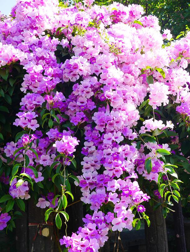 别称:紫铃藤、张氏紫葳,紫葳科蒜香藤属常绿攀缘灌木,植株蔓性,具卷须,叶为二出复叶,深绿色椭圆形,具光泽。花腋生,聚伞花序,花冠筒状,开口五裂。花期春季至秋季,盛花期8-12月。其花、叶在搓揉之后,有大蒜的气味,因此得名蒜香藤。蒜香藤盛开时,碧绿的叶丛间大朵大朵的紫、白色花朵成团簇生,如瀑布般串生在柔软下垂的枝条上,仿佛垂挂着的串串彩球,绚丽烂漫,令人心醉。园林用途适合花廊、花架、篱墙或荫棚美化。