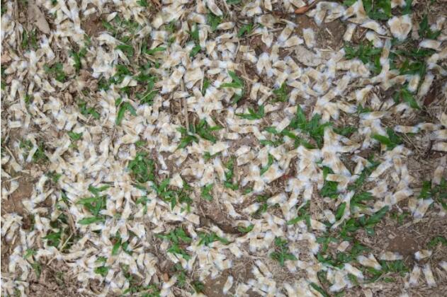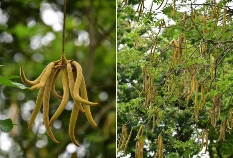 黄花风铃木的果实有个特别的名称—蒴果。刚长出的果实是绿色一簇簇的,看起来由一个个饱满胀鼓鼓的、外被绒毛的“豆角”组成,成熟后的果实由绿转为深褐色,会沿室间或室背开裂。当果实裂开,里面的数颗有翅的种子会随风飘散到周围或更远的地方,一旦时机成熟就可以开始新生命的孕育。