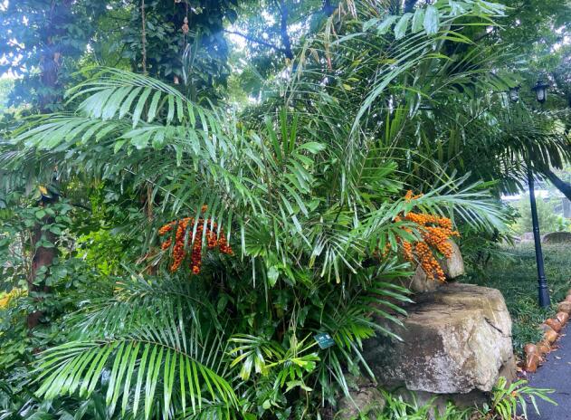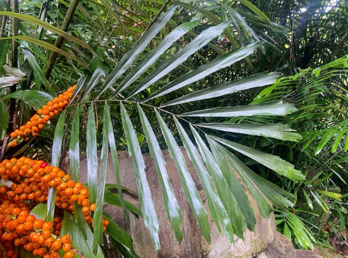 别称矮桄榔,棕榈科桄榔属常绿灌木。茎密披棕褐色叶鞘纤维。羽状小叶边缘及顶端有啮蚀状锯齿,叶片大型,羽状全裂,叶长5~8 m;羽片多数,长35~50 cm,倒披针形,背面灰白色,边缘及顶端有啮蚀状锯齿。花橙色,具芳香。果近球形,直径2~2.5 cm,熟时红至紫红色,内有播种1~3粒。花期:4~6月;果期:6月至翌年3月。