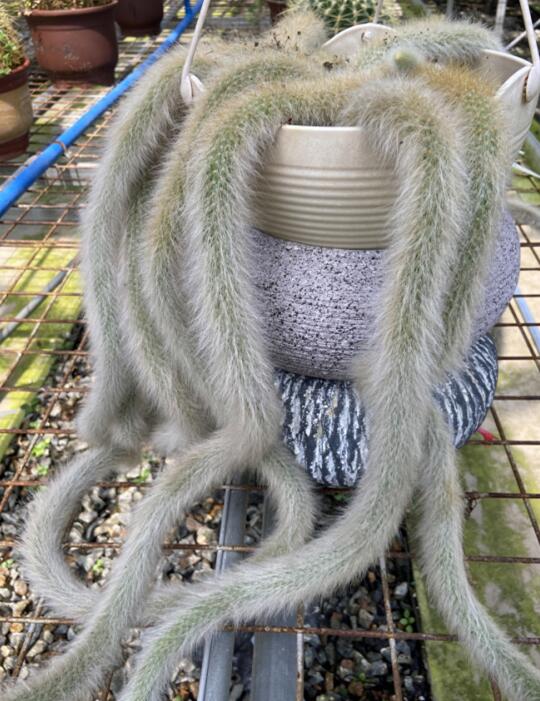 仙人掌科管花柱属多肉植物,原产玻利维亚,其肉质茎非常柔软,直径约2厘米左右,长度可达1.5米左右,幼苗期直立生长,成株以后开始进入悬垂生长,柱体密被白色长毛,因形似猴尾,故而得名猴尾柱,而分枝长到9条以上的时候大家又将其称为九尾狐或九尾妖狐。