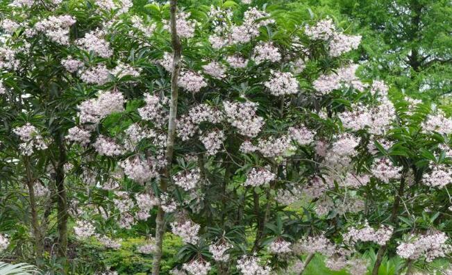 原产于中国海南、广东与广西,越南地区亦有分布。广东地区园林绿地有栽培。喜温暖潮湿气候。略喜光,耐阴;生长适温20~30 ℃ ;较耐旱。喜富含腐殖质排水良好的土壤。播种、扦插或分株繁殖。树姿婆娑,圆锥花序大而新奇、色彩明丽,且柔顺下垂,是极佳的优良观花树种。适宜丛植, 用于庭园观赏。