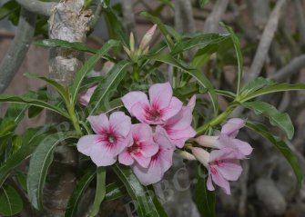 拉丁名: Adenium obesum Roem. et Schult. 夹竹桃科,沙漠玫瑰属,又名天宝花。常绿灌木,株高4~5 m。树干肿胀,茎粗壮,分枝多。叶互生,革质,倒卵状披针形,长8~12 cm,宽2~4cm,有光泽,盛花...