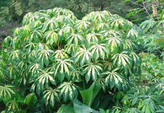 拉丁名: Manihot esculenta Crantz. Variegata 大戟科,木薯属。直立落叶灌木,高1~2 m。长块根,根部肉质。叶面绿色,叶掌状,3~7 深裂,长10~20 cm,掌状深裂至全裂,裂片中央有不规则的黄色斑...