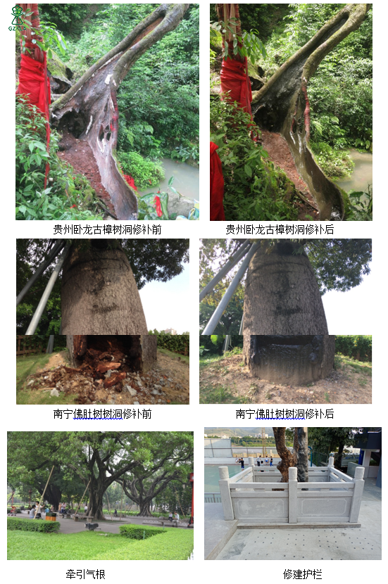 依托《广州市古树名木的养护复壮技术研究》、《古树衰老诊断技术研究》、《生境改造技术对古树群保护的综合研究》、《古树根腐病调查及防治对策研究》、《澳门树木褐根病病因及诊断技术研究》,我院自主研发的“弹性环氧树脂树洞修补技术”,填补了行业空白。现配备深根施肥仪、高射程喷雾机、电动打磨机和电钻搅拌机等仪器,全面实施古树(大树)名木抢救复壮工作。针对不同古树(大树)名木的生长现状,全面诊断并制定“一树一策”的抢救复壮措施,主要复壮措施包括:(1)扩大树池及立地土壤的改良;(2)施肥复壮、促根壮根;(3)病虫草害及白蚁防治;(4)修枝整形及寄生物清理;(5)树洞修补和切口封补;(6)修建支撑;(7)牵引气根;(8)修建围栏、护栏等。对古树(大树)名木进行复壮抢救,能延缓树势衰老速度、提高树体生理机能。